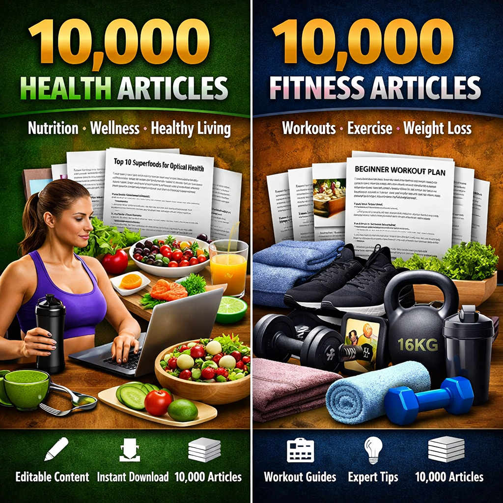 Save time and grow your health and fitness business with this massive bundle of 10,000 professionally written articles. Perfect for bloggers, YouTubers, Instagram creators, fitness coaches, and marketers, this pack gives you unlimited content at your fingertips